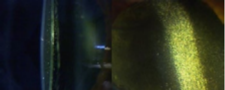 传统丙烯酸酯材料 存在的问题是什么? 传统疏水丙烯酸酯材料通常含水量< 1%,易出现闪辉问题¹ 晶体闪辉是怎么形成的呢? 疏水丙烯酸酯聚合材料网格中的水分一般以水蒸气形式存在,如温度波动,水分饱和,就会在聚合网格的空洞中积聚,形成微小囊泡,又因水与丙烯酸酯的折射率显著不同,光在水与丙烯酸酯表面发生折射,造成了亮晶晶的外观现象,即闪辉的形成。 晶体闪辉对视觉质量 都有哪些影响呢? ① 通常在术后 3 年内有明显增长晶体闪辉会引起“杂散光”的增加²,如图所示; ② 导致 MTF 下降,影响成像质量; ③ 严重的闪辉可能需要二次手术,置换晶体。